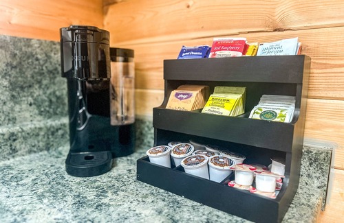 The fully equipped kitchen—complete with a full-size refrigerator, stove, microwave, coffee maker, creamer, tea, and all the cookware and kitchenware—makes meal prep easy and relaxing. The adjacent dining table seats four, ideal for family meals, game nights, or planning your next adventure.