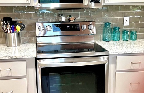The middle floor has two bedrooms, a bath with soaking tub and shower, and high Kohler toilet, living room, dining area and kitchen. The open living room has a stacked stone gas fireplace with a timer/thermostat which is very easy to operate. Wood floors and soaring tongue and groove ceilings add to the warmth. The well-supplied kitchen has quartz countertops and stainless steel appliances, including a French door refrigerator with icemaker, a convection and air fryer stove, over-the-stove microwave and dishwasher. The dining table easily seats eight, and the barstools and bar are convenient for quick meals. This floor leads to two decks: a covered area with a six-foot cedar swing, dining table and chairs; the other with chaise lounges and a gas grill.. Bird feeders attract many colorful birds and hummingbirds, which provide hours of entertainment.