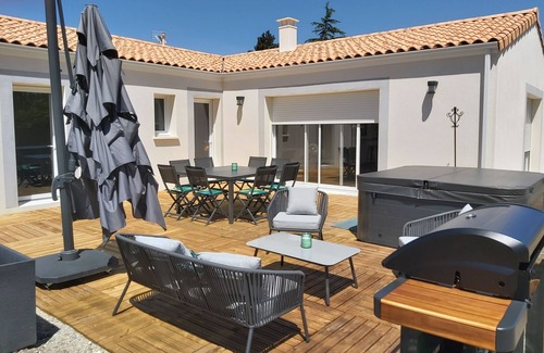 This single-storey house was built to accommodate holidaymakers. It is very functional, with a spacious, light-filled living room. Trendy decoration. A 5-seater spa on a 35 m2 terrace in a large enclosed garden with plants and a heated outdoor swimming pool.