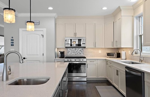 Be the 1st to rent this 5 bedroom 4 bath house conveniently located in the heart of Surf City. This home can accommodate a large family with in-laws or multigenerational families. The gourmet kitchen has ample cabinets, ice maker and high end appliances. The large dining room table seats 10 with an additional 6 counter stools to accommodate all guests for family dinners or hosting game night .The rear set of steps are conveniently located off the kitchen for easy access to the pool and fully fenced private yard.. Two outdoors showers and gas grill with natural gas line. Partial deck has partial ocean and bay views from the front decks for catching the famous sunsets of Long Beach Island. The upper level has four bedrooms, two are en-suite and the 2 additional bedrooms share the 4th bathroom. The main living area has the kitchen, dining room , living room den with barn doors and 5th bedroom with full bathroom. All the rooms are equipped with ceiling fans and a TV.. The garage area includes 1/2 bathroom , 4 lounges, 4 gravity chairs, Cornhole , dart board and giant Jenga for days spent hanging at the heated pool. Full size additional refrigerator in the garage for all your beverages. No need to go to the gym as the garage has a stationary bike and weights for the work out enthusiasts . The rear facing garage doors open to the pool for additional covered spaces. . Pool cleanings are on Fridays.