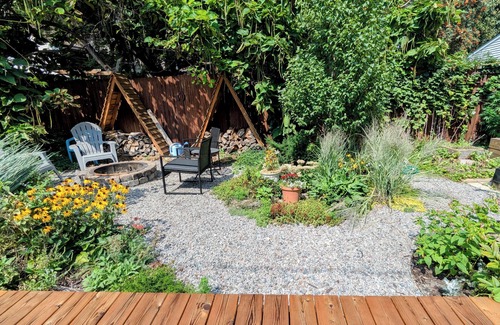 The back yard is spacious, with beautiful gardens packed with pollinator-friendly plants, a covered patio, firepit lounge, and an area for outdoor dining and grilling. Enjoy a peaceful morning coffee relaxing in the hammock, or gather around a crackling fire in the evening after a day out exploring the city.