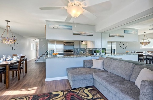 The main living area has an open floor plan with ample natural lighting and a fully upgraded kitchen including new SS appliances and granite countertops, with fresh paint and new flooring throughout the unit. There is table seating for 6 in the dining area. The couch pulls out for additional sleeping in the living area, where you can enjoy the large Roku TV and free WiFi.