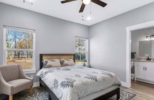 This new construction house has 2 bedrooms and an office that can be used as a third room. The master bedroom has a queen bed, bedroom 2 has a full-size bed, and the office has a day bed with trundle. This home will make you feel cozy and comfortable. It is close to downtown Springdale, Walmart home office, JB Hunt, and so much more. You will love the firepit in the evenings with lots of seating and space to relax! There is streaming offered on the TVs in the house so bring your log on info!