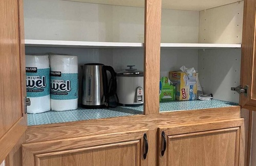 Keyless entry, 2 portable fans, central AC, and heat throughout. Private shades in bedrooms.