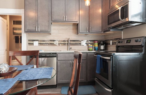 Cook meals in the fully stocked kitchen, gather at the dining table, or relax in the living area after exploring St. Louis. The washer/dryer and full bathroom with shower/tub combo make longer visits easy and comfortable.