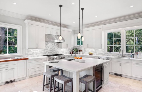 Throughout the interior, an open floor plan flows easily between rooms with ample space for family activities, gathering with friends, or retreating for some quiet time. Floor-to-ceiling windows frame the marsh and creek views with an abundance of natural light. The living area, which spreads across two rooms, enjoys a wall of windows overlooking the marsh, a coffered ceiling, fireplace with stone and wood surround with access to a rear covered porch. If you need to work from the home (though we hope you don't) there are two desks set up by the gas fireplace for a ready-to-use workspace. The newly renovated kitchen has plenty of custom cabinetry with marble and walnut countertops, a suite of upscale, stainless steel appliances, and a center island with wine cooler, and a prep sink with its own water filtration system.