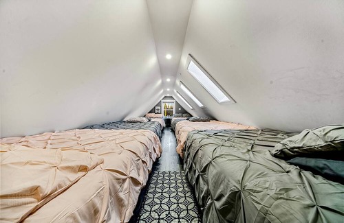 Bold, contemporary furnishings are found throughout the house, with open-concept living spaces that encourage easy entertaining. At the heart of the home is a beautifully appointed gourmet kitchen, complete with top-of-the-line stainless steel appliances (including a wine fridge). Take your meals at the island bar, around the kitchen table, in the dining room, or outside on the porch with a view of the surrounding woods and mountains. Back indoors, enjoy playing board games by the 75K-BTU linear gas fireplace or streaming movies on one of several smart TVs with Disney+ and Netflix (with your own accounts). Upstairs, there's even a desk in the den where you can escape to log onto the high-speed WiFi. When it's time to turn in, choose between two bedrooms, a fun bunk room for the kids, a sleeping den with a crib, and a child's bed in the living room. A washer/dryer and mini-split AC are provided for your comfort as well.