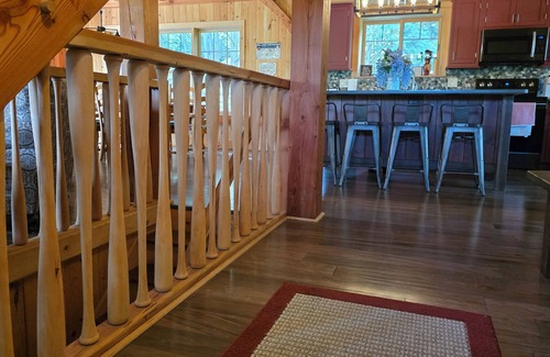 Upstairs has 3 bedrooms each with open beam cathedral ceilings. Each bedroom has a ceiling fan and it's own heating/cooling. Large master bedroom with TV, couch, two closets and private bathroom. 2nd bedroom has queen bed and 3rd bedroom has twin-over-queen bunk bed. 2nd full bath with walk-in shower.