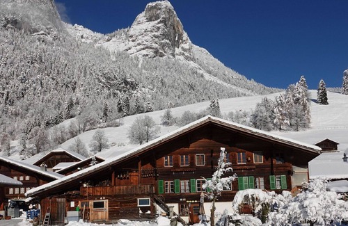 Living room with TV, dining table and sofa. Cosy holiday flat in a farmhouse, in a quiet location. Small and simple kitchen with dining table. Small balcony with table and 2 chairs (additional folding chairs available) Bedroom 1 with adouble bed and a youth bed (140 cm) Bedroom 2 with a double bed. Bathroom with bathtub and separate shower. Public transport included in the Simmental and Saanenland with the SIMMENTAL CARD: Overnight guests in the Lenk-Simmental holiday region travel free of charge on public transport for excursions with a valid guest card.