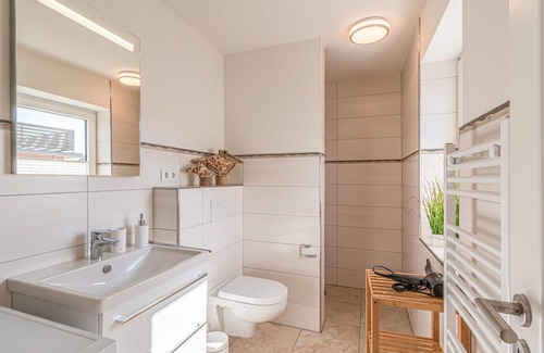 The comfortable holiday home with good standards and attractive furniture is spread over two floors and offers ideal conditions for a family holiday in Schleswig-Holstein. On the ground floor you will find the bright living area with open-plan kitchen and dining area, where you can spend cosy hours with family or friends. One of the bedrooms with a double bed is also located here. The upper floor houses another bedroom with a double bed. For extra comfort, the entire house is equipped with underfloor heating. The house also has an open terrace with garden furniture where you can relax in the sun and enjoy a peaceful holiday.