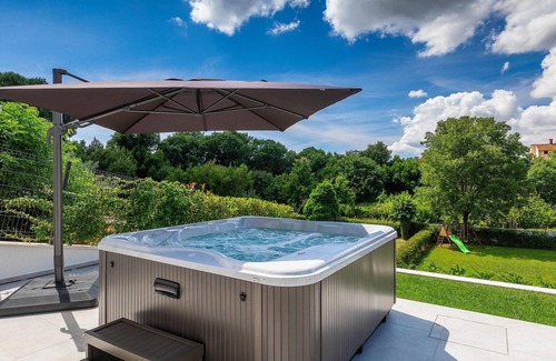 Villa Cascada is located in the small town of Munti on the outskirts of Pula and only 5 kilometres from the international airport. It offers you easy access to the city and at the same time a multicultural experience at your fingertips. Enriched with a modern interior and exterior and a touch of Istrian rusticity, the villa offers you an ambience that will take your breath away! It was built in early 2023 and is now ready to open its doors to guests looking for a luxurious and peaceful holiday with friends or family. You will stay comfortably in 3 double bedrooms (one of which has two single beds that can be put together if desired). Each bedroom has an en-suite bathroom with fully equipped shower cubicles. Guests also have access to a washing machine, tumble dryer and ironing facilities. In the spacious living room there is a three-seater sofa with queen-size bed, LED TV and modern details. It is of course important to mention that the kitchen has an impressive view of the greenery through the sliding glass walls! The kitchen is fully equipped and furnished with minimalist touches that facilitate the preparation of a light lunch as well as a rich dinner, which is indeed a tradition in Istria. In front of the villa there is a beautiful swimming pool, also enriched with greenery, where you can find cooling shade during the summer heat or enjoy the Istrian sun on the sun loungers by the pool. In addition to the swimming pool, this villa offers a relaxing wellness area and an outdoor whirlpool. In the shade of the palm tree you will find a children's playground with a slide and swings, as well as a gas barbecue for outdoor cooking. Villa Cascada offers you relaxation for body and soul, while the enchanting village of Muntic will delight you with its distinctive Istrian ambience. Villa Cascada is located in the village of Muntic in the municipality of Liznjan in south-east Istria. This colourful village has a rich history dating back to Roman times. It was first mentioned in the 14th century and the current Gothic-style church of St Jerome was built in the 16th century. Get to know the charming local people and their home-made products, which you can use to prepare Istrian dishes. Traditional singers and musicians from Muntic will entertain you. Visit the tourist centres of Medulin and Pula. Medulin is an old fishing village and a modern tourist centre. Explore the sandy beaches on the southern coast of Istria and sample the traditional cuisine of the region in restaurants and taverns. For adventurers, there is an adrenaline park, while history lovers can visit the Vizula Archaeological Park, the historical park of the municipality of Medulin. Set sail for the islands of the Medulin archipelago Ceja, Levan or Bodulas. You can also explore the charming village of Marcane. In the immediate vicinity of Marcana is Duga Uvala, where you can enjoy the 300 metre long beach. You can explore the underground of the Marcana Riviera in the Ljubic Cave, the Golubinka Cave or the Peresin Cave. Pula is definitely an unmissable destination. In the largest city in Istria, you can visit the Pula Amphitheatre, the Temple of Augustus, the Golden Gate and many other cultural and historical monuments. Enjoy the beautiful beaches and breathtaking scenery.