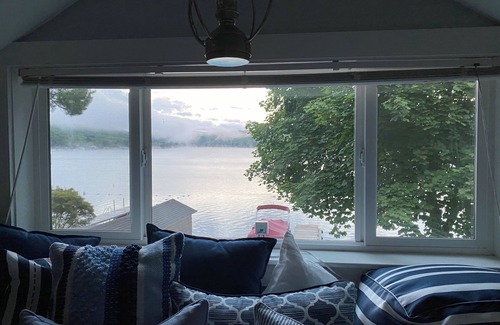 Living space is open and airy with large windows that frame breathtaking views of the lake. Features a fully-equipped modern kitchen. Bedrooms are thoughtfully appointed with plush bedding. The downstairs bedroom features a queen bed and the upstairs features a queen bed and a twin daybed that expands if needed. The living room has both full and twin pull out sofas.