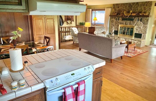 At the Rocking H, you`ll find ample space, beds, and amenities for up to 8 guests. This ranch-style home exudes timeless charm with wood paneling and carpeted floors, offering a clean, comfortable, and entertaining stay for all.