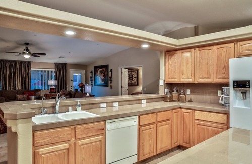 Beautiful vacation rental home, professionally decorated in Tuscan style, offering a spacious 2365 sq ft, 4 bedrooms with a master suite and a junior master bedroom, 3 full bathrooms, front courtyard, kitchen with polished travertine counters, 2 breakfast bar islands with bar stools, newer refrigerator, dining area with a large table, pantry, huge family room with sofa, love seat, oversized chair & ottoman, 2 club chairs & table, 65" TV with cable TV, WIFI, master suite with a TV, patio door to the backyard, master bathroom with a walk in shower & separate soaking tub, jr. master suite has a 43" TV and it's own full bathroom, large .33 acre yard private resort style backyard, sparkling pool & spa (spa available to heat only in the winter months-at your cost for propane. You must notify the property manager at time of booking if you wish to heat the spa. An additional $250 deposit will be collected. The cost is $25 per hour to heat the spa, NO POOL HEAT) A margarita table & umbrella, baja shelf, cool decking, full width solid patio cover with ceiling fans to keep you cool, alumawood lattice patio cover with LED string lighting, stainless steel BBQ, comfortable patio furniture, located in a quiet culdesac with sidewalks and curbs, nicely landscaped yards. NO ACCESS OF THE GARAGE/NOT AVAILABLE. Be sure to ask about the RV (no hook ups) parking for size to verify if your RV/Boats will fit (8 feet wide side parking). Security cameras are on the exterior of the property for security purposes. (front, side of the garage, & front door) The air conditioner is kept behind a lock box and is set to 76 degrees. Please be sure and bring ice as the kitchen icemaker is not producing. Located close to the new Havasu Riviera launch ramp. Once you rent here you will keep coming back.