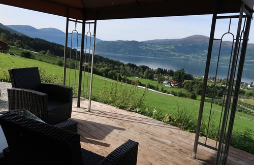 Beautiful timber house "Nystova". 2 km from the centre of Innvik, 36 km from the centre of Stryn, 38 km from the centre of Sandane, on a slope, 1.5 km from the sea, 1.5 km from the fijord. Private: natural state property with meadow, parking on the premises. Shop 2 km, supermarket 36 km, bus stop "Innvik" 2.1 km, ferry "Bergen" 265 km. Mountain railway 27 km, ski lift 17 km, fishing possibilities 1.5 km.