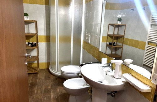 The apartment "La Rosa" is a cozy living solution, ideal for those seeking comfort and functionality in a well-organized space. It features a modern bathroom with a shower, essential sanitary fixtures, and a small anteroom, useful as a utility space. The room is equipped with air conditioning to ensure a cool and relaxing environment even on the hottest days and is thoughtfully furnished, including a sink, a dining table, a refrigerator with freezer, a coffee machine, and a flat-screen TV. Wi-Fi connectivity allows you to stay connected at all times, whether for work or leisure. Outside, a charming veranda features a second table, perfect for outdoor lunches or dinners, as well as an induction cooktop, ideal for cooking while enjoying the outdoor atmosphere. A functional and welcoming apartment designed to meet every need.