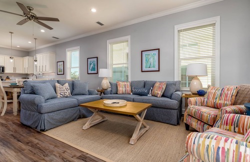 New Construction. 5 bedroom, 5 bath with a loft. Elegant, spacious with designer furnishings. The home freatures spectacular views of the Gulf of Mexico. The downstairs master faces the Gulf and has a king bed and large bathroom with a walk-in shower. The other 2 downstairs bedrooms have queen beds. One has a private bath and the other has a shared bath in the hallway, both with walk-in showers. The unit has ample kitchen space with beautiful marble counter-tops and stainless appliances. Upstairs you will find a sleeping loft with a full/twin bunk and a seperate full size bed. The loft features a large TV, the perfect escape for the kids! There are 2 additional bedrooms upstairs with King beds. Both have bathrooms with shower/tub combos. The living area has a huge TV and faces the beach. The unit has its own private, heated pool. Ocean Pearl is a fabulous home to relax in, on the beach! Wet Bar with pebble ice; Gas Grill; Elevator; Private Pool; Commercial Ice maker.