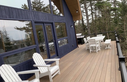 Cedar Chalet is a 3 bdrm / 3 ba house on a private, wooded lot overlooking Frenchmen's Bay. Exceptionally large windows offer water views from almost every room. The large deck is a quiet, relaxing spot to watch the sunset at the end of the day or enjoy coffee in the morning with the eagles flying overhead.