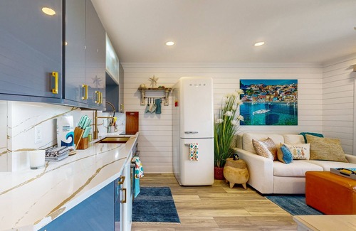 Experience comfort at this colorful fully renovated luxury ocean view condo located in the heart of Isle of Palms, SC. The interior of this condo is decorated with a vibrant color palette, shiplap walls throughout, lavish bathroom, plantation shutters, and Smeg appliances, creating a welcoming and stylish atmosphere.