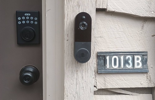 There is an code entry keypad, full kitchen, bathroom, futon and a queen size bed. Pets are welcome!