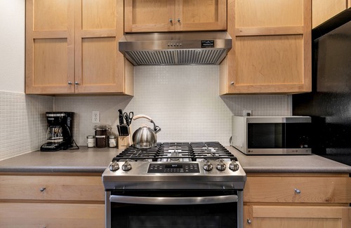 KITCHEN: Fully equipped kitchen with Maple shaker cabinets and stainless-steel appliances, microwave, cooking basics, dishware/flatware, spices, complimentary coffee, creamer, tea and sweetener