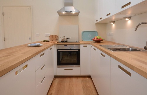 You’re welcomed directly into a generously sized living space which is nicely divided into a sitting area with comfy sofa and chair around the wood-burning stove, plus a smart dining table with four chairs conveniently sitting next to the well-equipped kitchen area. Both tastefully furnished bedrooms are at the back of Old Trout, making it a quiet spot for a good night's sleep, with the luxurious bathroom close to both.