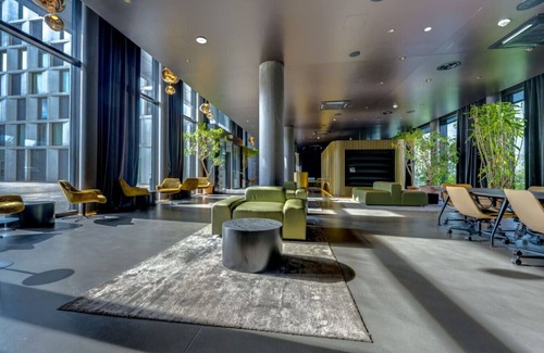 Ein Hauch von Glamour empfängt dich, sobald du das Gebäude betrittst. Die Lobby ist in entspannendes, gedämpftes Licht getaucht und kontrastiert mit den schimmernden goldenen Elementen in der Eingangshalle. Der offene Bereich im Erdgeschoss bietet eine Entspannungszone, in der du dich mit anderen Personen die neu in Zürich sind, treffen und austauschen kannst.