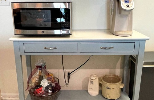 There is a complete kitchen, fully stocked for snacks to cooking full meals.