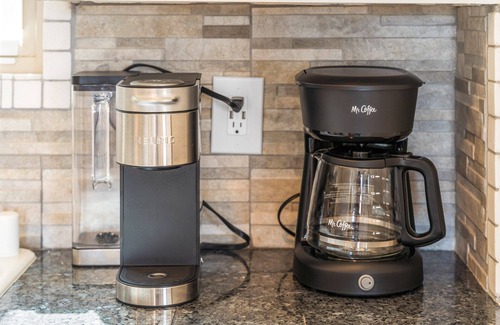 Inside, you'll find a beautifully designed living room, complete with comfy sofas, a flat-screen TV, and large windows that let in plenty of natural light. The open-plan kitchen and dining area are fully equipped with modern appliances and sleek countertops, perfect for preparing delicious meals and entertaining guests. Kitchen is stocked with a starter pack of ground coffee, Kcups, sugar, salt, pepper, and other seasonings
