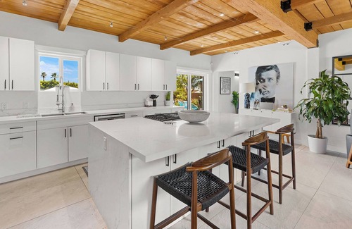 Welcome to Palo Santo, a 1948 Rancho Mirage beauty. It’s stylish, cool, and the interior and exterior have been completely remodeled, yet retained original touches like tongue and groove wood ceilings. The interior features designer furnishings, open concept floorplan, gourmet kitchen, great room, media room, and 3 bedrooms and bathrooms. Walled and gated for privacy, the backyard has a pool with tanning shelf, spa, firepit, outdoor lounge and mountain views. It's a lovely home, spectacularly close to the mountains in the heart of the Coachella Valley.
