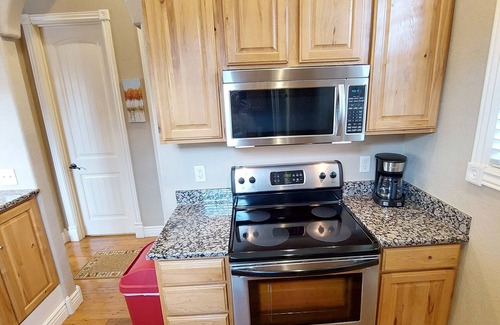 We personally clean, manage, and maintain this property to ensure everything is perfect for your stay! This beautiful suite has a log cabin exterior and has been gorgeously remodeled. It also includes all new furnishings from Nebraska Furniture Mart. This spacious property boasts all the comforts of home with two Serta king-size mattresses, stainless steel appliances, washer & dryer, electric log fireplace, fully equipped kitchen (including all dishware, cookware, and utensils), premium coffee maker (all supplies provided complimentary), spacious living room with tall ceilings, over-sized jetted tub, and two ceramic tiled showers.