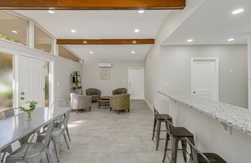 Unit #4 is a private unit with a Queen Bed, kitchenette with hot & cold water in sink, convection countertop microwave, mini-fridge, black-out curtains, streaming TV, walk-in closet nightstand and dresser. This unit's en-suite private full bathroom has a shower, individually controlled mini-split A/C. This unit has a private exterior door to the covered carport. Keyed lock on bedroom door and the door to the hallway shared with Unit #3 for additional privacy.