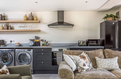 This newly decorated barn is set over two floors and furnished to a very high standard. Enter the property into the open plan kitchen and living room which is a beautiful room for dining and relaxing with views out to neighbouring gardens. On the ground floor is also a walk-in shower room. The large bedroom on the mezzanine floor is quirky with its beautiful beams, large windows and glass balustrade offering a bright and peaceful sleeping space. The bedroom has a high quality king sized bed to ensure a good night's sleep with hotel style linen and toiletries. Downstairs is the second bedroom accessed via a corridor off the main room. Outside are two private sitting areas perfect for enjoying a sun downer with views across the tended lawns and gardens of the host's property.