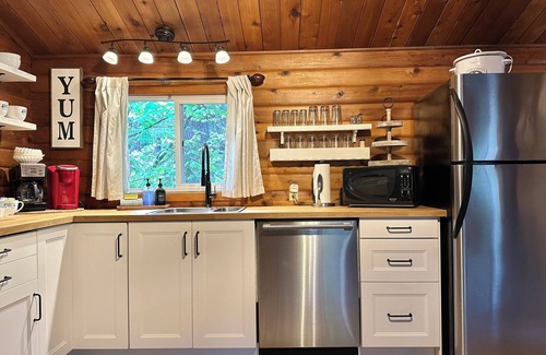The full kitchen includes a stove, refrigerator, microwave, coffee maker, newly added dishwasher, and all essential cookware. Gather around the table for four to enjoy a hearty meal or a quiet morning coffee by the fire.