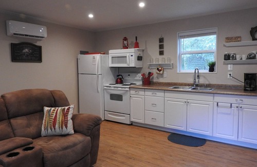 The cabin includes a queen-size bed, bathroom with shower, recliners, 7.5 cu ft apartment-size refrigerator/freezer, coffee station, 7-gallon water heater, full-size stove with overhead large microwave. The kitchen is stocked with cookware, dishes, flatware, etc.