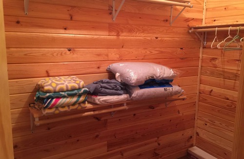 The interior has a large open living room, dining and kitchen area equipped with a flat screen TV, DVD player, and Firestick streaming device. The large bedroom has a queen size bed, a trundle day bed, and a walk in closet. The kitchen is equipped for four guests, has a refrigerator, range/oven, microwave, Keurig and a drip coffee maker. Outside the front door is a large, south facing, covered deck for year round comfort. This peaceful deck is great for viewing wildlife or great for rest and relaxation.