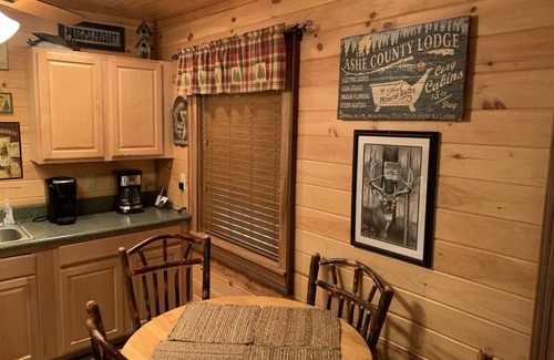 Charming little Cabin nestled in the Blue Ridge Mountains located along the old Virginia Creeper Train Route on the rural banks of Big Horse Creek, a rushing Trout stream. This recently remodeled cabin sleeps 4, with 1 bedroom, 1 bathroom, a pull out sleeper sofa, a full kitchen with all the amenities. There is a living room where guests can relax, read a book or take a nap in the recliner. The cabin has a wrap around deck and a large table for outside dining. Guest(s) can relax, enjoy the fresh mountain air, and take in the waterfront views and sounds of rushing currents as they pass by. There is a grill for cooking out, a Hot Tub to soak away stress, and there is a Fire Pit for those who wish to build camp fire after dinner along the creek. For the kids the cabin has Satellite TV, a VCR with plenty of old classic movies. For fishing enthusiasts, Big Horse Creek is a NC State stocked Trout Stream. You can practically cast your fly rod from off the wrap around deck. Creekside Serenity is located within 20 minutes of the world famous historic Shatley Springs Family Style Restaurant, downtown West Jefferson, home of North Carolina's only Cheese Plant and many Antique Stores and Art Galleries. Also just a short drive further, visitors can take in the beautiful Churches of the Frescos, Blue Ridge Dinner Theater, Mount Jefferson State Park, Ashe County Court House Museum, Tweetsie Railroad, Mystery Hill, or shop the outlet stores in Boone, NC, drive the Blue Ridge Parkway, or canoe the New River.