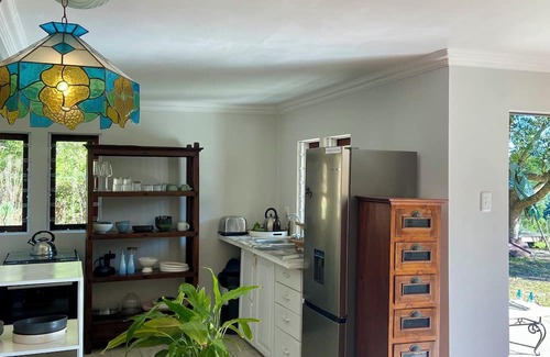 The light & bright cabin is open plan & fully kitted with everything you may need. Gas stove, indoor fireplace, queen sized bed, work space, wifi & a gorgeous sunny patio plus braai. Additionally a cute retro caravan serves as a second bedroom with 3/4 bed plus a lookout deck. A bird lover's paradise with private nature trail!