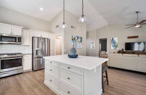 This home is like no other. This is a virtually new home as the entire interior and exterior have been beautifully updated. Let the pictures do the talking! All updating was completed in 2022 to include: flooring, lighting, quartz counters, cabinetry, tub and shower surrounds, full suite of appliances, all the furniture, smart TV's, shutters, full paint job both interior and exterior, paver patio and driveway, even the garage floor was epoxy coated. For bookings between November - April check with host as we look ideally look for a 3 month minimum rental.