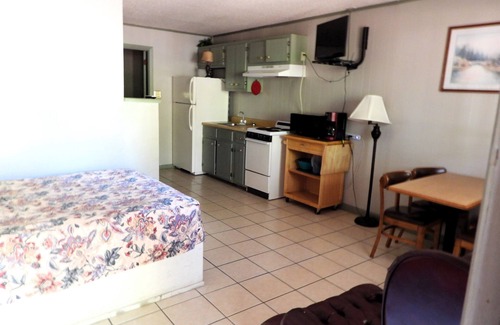 The Pine motel kitchenette features a studio style room with double beds separated by a 3/4 wall, a full kitchen, a common shared deck with 5 sets of patio furniture, access to 3 BBQ grills and satellite TV. Overnight boat slips are available for $20 per night.