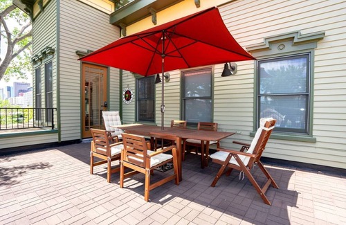 Upon entering through the front gate, guests will be immersed in the elegance of The Curtis Park Club. The front lawn is beautifully landscaped with lush greenery and communal areas for guests to eat a delicious lunch from a local eatery. Looking for outdoor adventure? There are several boutiques and local restaurants steps away from The Curtis Park Club. For natural homebodies, there are two indoor communal areas. The downstairs communal area is smaller, but beautifully decorated with perfect seating for five guests. Upstairs, there is a larger communal area that seats twelve to fourteen. In these inside communal areas, guests are welcomed to interact with other travelers, indulge in a novel, or take photos with their friends.