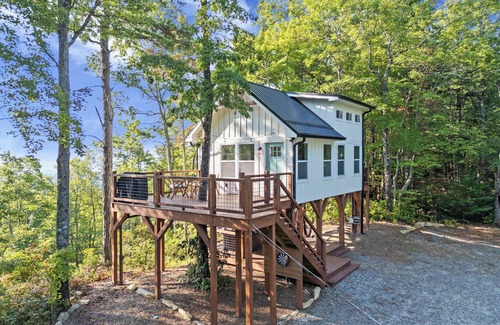 Newly constructed, private treehouse on a secluded 7-acre mountain top property. With HUGE views, private acreage, and tons of outdoor living space, our 385 sq-ft treehouse won't disappoint. This unique property is surrounded by the Pisgah National Forest and close to Dupont State Forest, Nantahala National Forest, and Gorges State Park. Plan to hike to waterfalls, fly fish, kayak, tube, and visit local breweries, or just decompress, relax, and enjoy the spectacular mountain views! AWD and 4x4 is not required to access the property, however, the 1 mile drive off the highway is a bumpy gravel drive so drive slow and low ground clearance is not recommended.