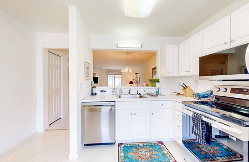 The open-concept living area is tastefully decorated and has plenty of natural light. Spread out comfortably in the carpeted living area and get ready for an entertaining evening streaming your favorite show on the smart TV with streaming services. And if you are visiting during the winter months, the gas fireplace is ready to keep you nice and toasty. The living area opens onto a screened patio with seating to enjoy your morning coffee. The townhouse also boasts a fully equipped kitchen with modern appliances, perfect for preparing delicious meals.