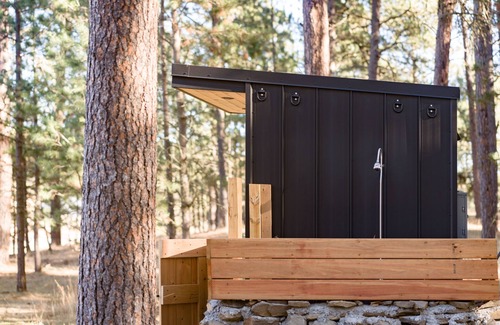Tucked away in the forest, the stand-alone shower haus offers modern amenities for rinsing off a day of exploring. This is a shared space for all guests at the property. Included with your stay is a set of plush towels plus a luxury microfiber robe to enhance the sense of calm and relaxation. All shower amenities are provided during your stay. We hope that you relax and recharge. For those feeling a bit more adventurous, be sure to check out the outdoor shower. Look up to blue skies and Ponderosa pines.