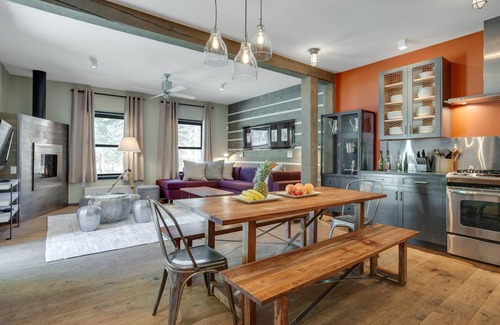 In the living room, a mid-century sectional sofa faces a chic, steel firebox and large-screen TV, accented by an industrial coffee table. Through a grand entryway, the living area flows into an eat-in kitchen, where a family-style dining table seats up to 8 guests. Fully equipped with stainless steel appliances and a wet bar, the kitchen offers plenty of room for crafting hot cocoa and cocktails after a day on the slopes, or baking a batch of cookies on a snowed-in afternoon.