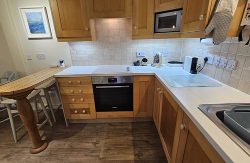 Entrance level: The front door leads into the kitchen area, with fully fitted units and appliances, a breakfast bar with stools, and a living area, with sofa and Smart TV, and a bay window that has views of the harbour. There is a double bedroom with 4'6" bed and storage, and a shower room with WC and wash basin.