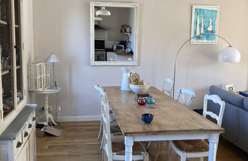 At ground floor there is an entrance hall, WC and a large double bedroom with an ensuite shower room. The renovated original staircase rises from the central lobby up to the 1st floor 7m x 7m open plan main living area with lounge, dining area and well equipped kitchen - range cooker, microwave, fridge, kettle, toaster and dishwasher. The dining table comfortably seats 8 people and the living area has a sofa and two armchairs, a TV with access to some French and British TV and a DVD player with a collection of popular movies. There is also a CD player/Iphone dock with speakers and a collection of CD's.