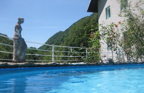 Pri Mačku is a holiday house in the Triglav National park 6 km from Tolmin. It’s in the middle of nature with great views on the mountains. With 2 bathrooms, 5 bedrooms, a large living room and a well equipped kitchen, up to 13 persons can stay with all comfort. Outside is a large covered barbecue area, a private pool and a hot tub, both open from 15th of May till 15 September. Pri Macku offers her guests a special place with all privacy in the middle of nature.