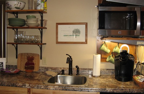 The small kitchenette includes a table & 2 chairs, large refrigerator, a small convection microwave oven (operates as an oven and as a microwave), dishwasher, a Keurig coffee maker, & a drip coffee maker, a sink with garbage disposal, toaster, electric skillet, 2 single induction ranges with pots and pans, and other essentials. Gas grill on back patio.