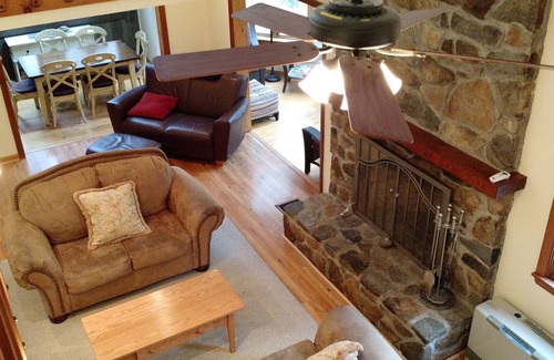 The house is located on a large secluded private lot in a heavily wooded area of the Eastman resort community. It has an open floor plan with two separate living areas, 5 bedrooms (sleeps 11 plus), 3 bathrooms, dining room, sun room, office loft, open deck and covered porch. There are many large windows and skylights providing natural lighting and wooded views. The living area on the main floor features a large stone fireplace giving it a chalet feel and provides a spacious area for socializing, while the second living area on the lower level features a large flat screen tv for gaming/videos, cable provided, a foosball table and gas potbelly stove and is perfect for kids, sports enthusiasts or anyone else who wants to break from the group.